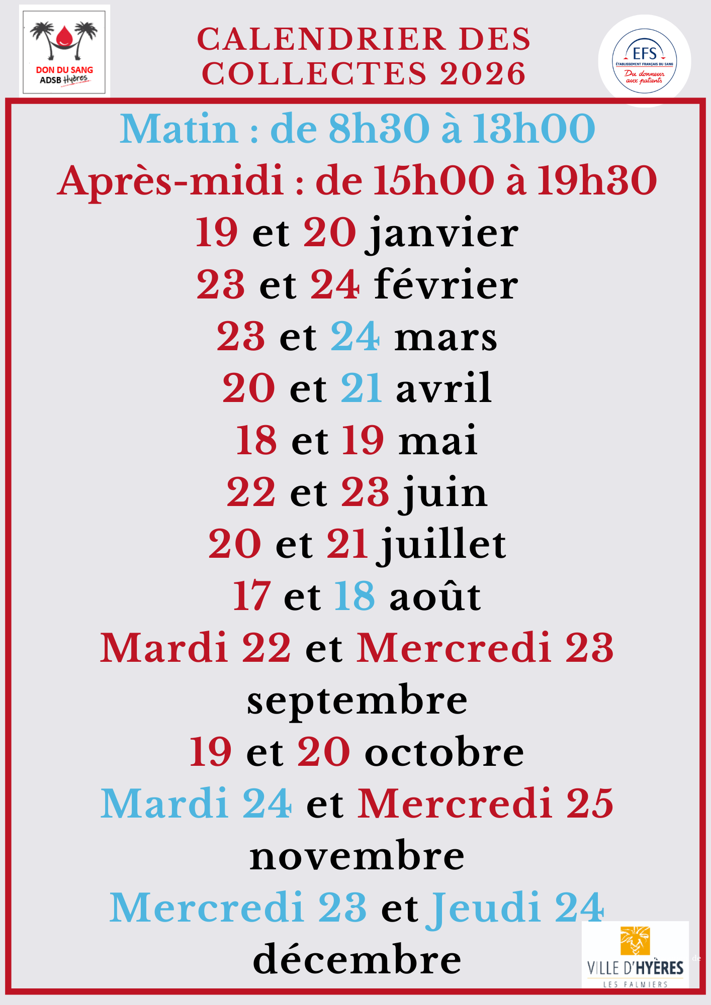 Tous les mois à lieu sur Hyères une collecte de sang réalisée par l'Etablissement Français du Sang. Nous les aidons a faire la promotion de cet événement et nous organisons également des événements pendant les collectes: tombolas, collectes gourmandes, etc ...